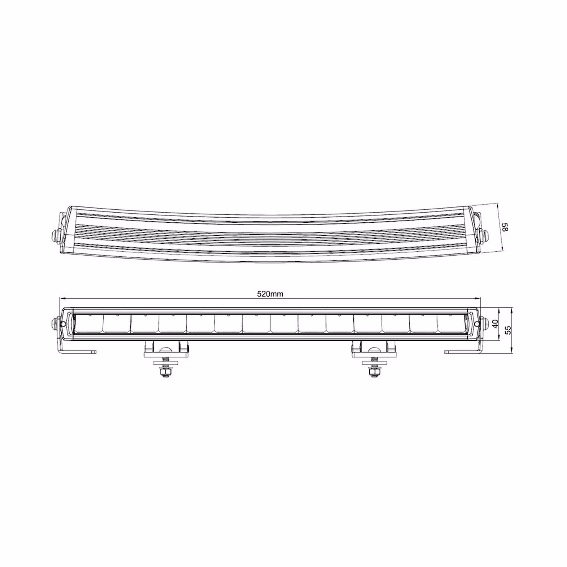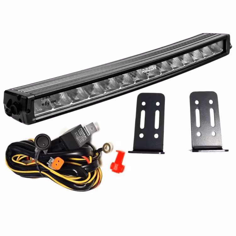 E-godkänt extraljuspaket innehållandes 1 st LED ramp Razor Drivers Edition Curved 98W 20 tum, 1 st extraljushållare, reläkabelsats för 1 st LED ramp. Kastlängd på 420 meter vid 1 lux.