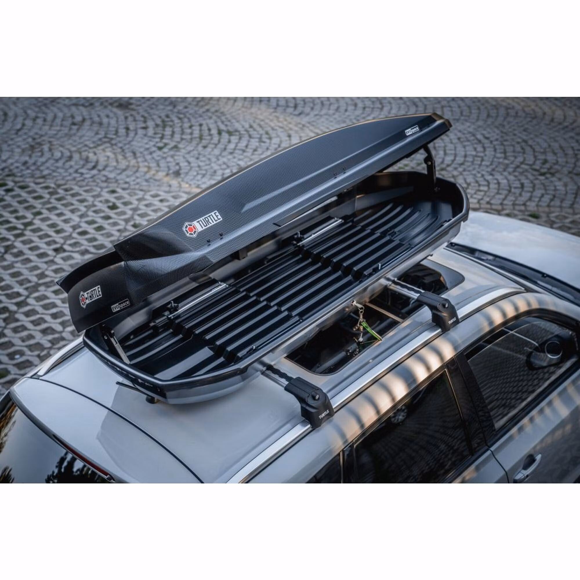 Turtle EVO Space kan öppnas från båda sidor, vilket gör det mycket praktiskt att lasta in och ur, och att du aldrig behöver stå med ryggen mot trafiken om du behöver stanna för att komma åt din packning under resan . Takboxen är helt tillverkad av 5 mm ABS-plast vilket gör att boxen känns stabil och välbyggd.