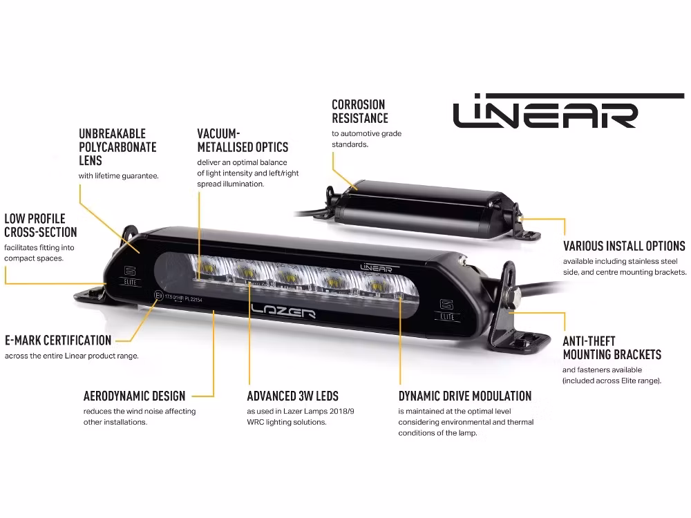 Linear 6 mäter bara 220mm i längd, 40mm i höjd och väger mindre än 500gram och kan därför installeras på alla vardagliga fordon utan att äventyra fordonets estetik. En kantlös "obrännbar" polykarbonatfrontlins med hårdlackat lack, möjliggör förbättrad aero prestanda och förhindrar uppbyggnad av is/snö/smuts som annars skulle kunna störa ljusfördelningen. Motorns korrosionsbeständighet, tillsammans med rostfritt stålfäste och fästelement, säkerställer att lampans avancerade styling förblir i utmärkt skick under många år framöver.