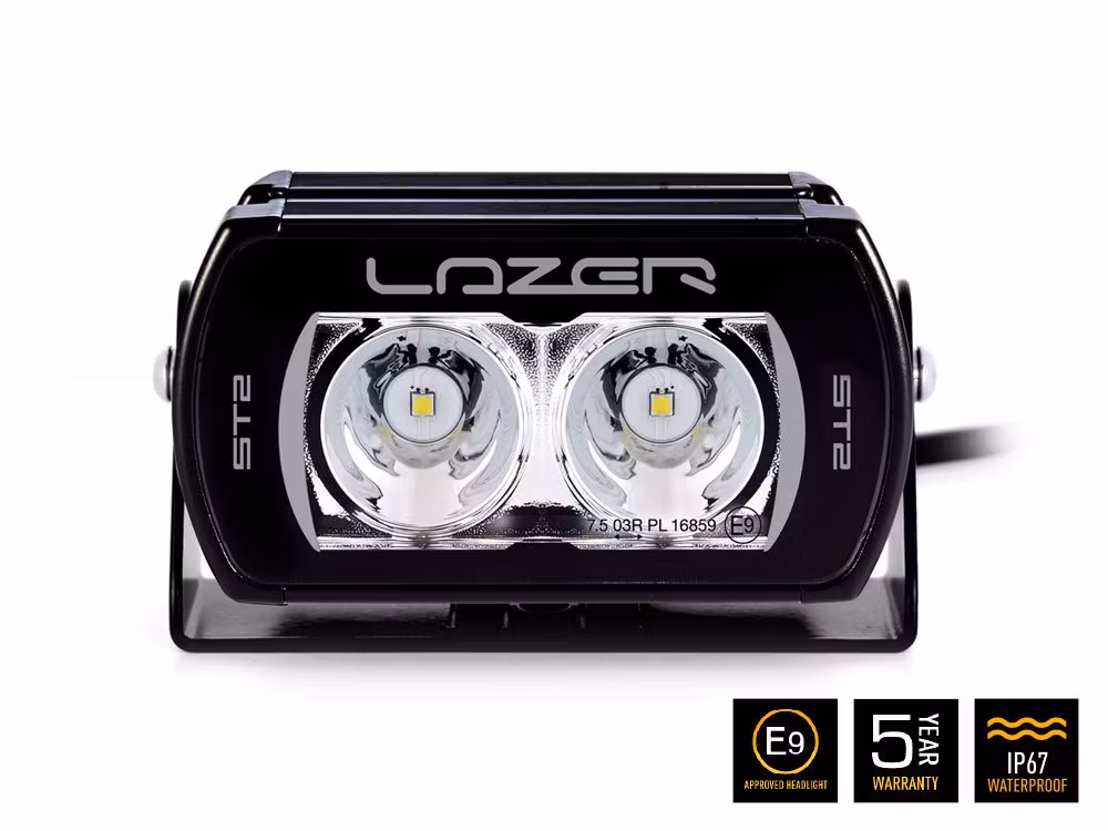 E-märkta ST2 Evolution är Lazers minsta LED ramp men klarar av att leverera en märkbar uppgradering jämfört med ett fordons helljus. Räckvidden på ljuset sträcker sig nästan 400 m bort och bevisas att storlek inte definierar prestanda. Med endast 124 mm i längd blir ST2 det självklara valet när utrymme är viktigt eller när man vill komplettera andra extraljus med en separat spridningsvinkel.
